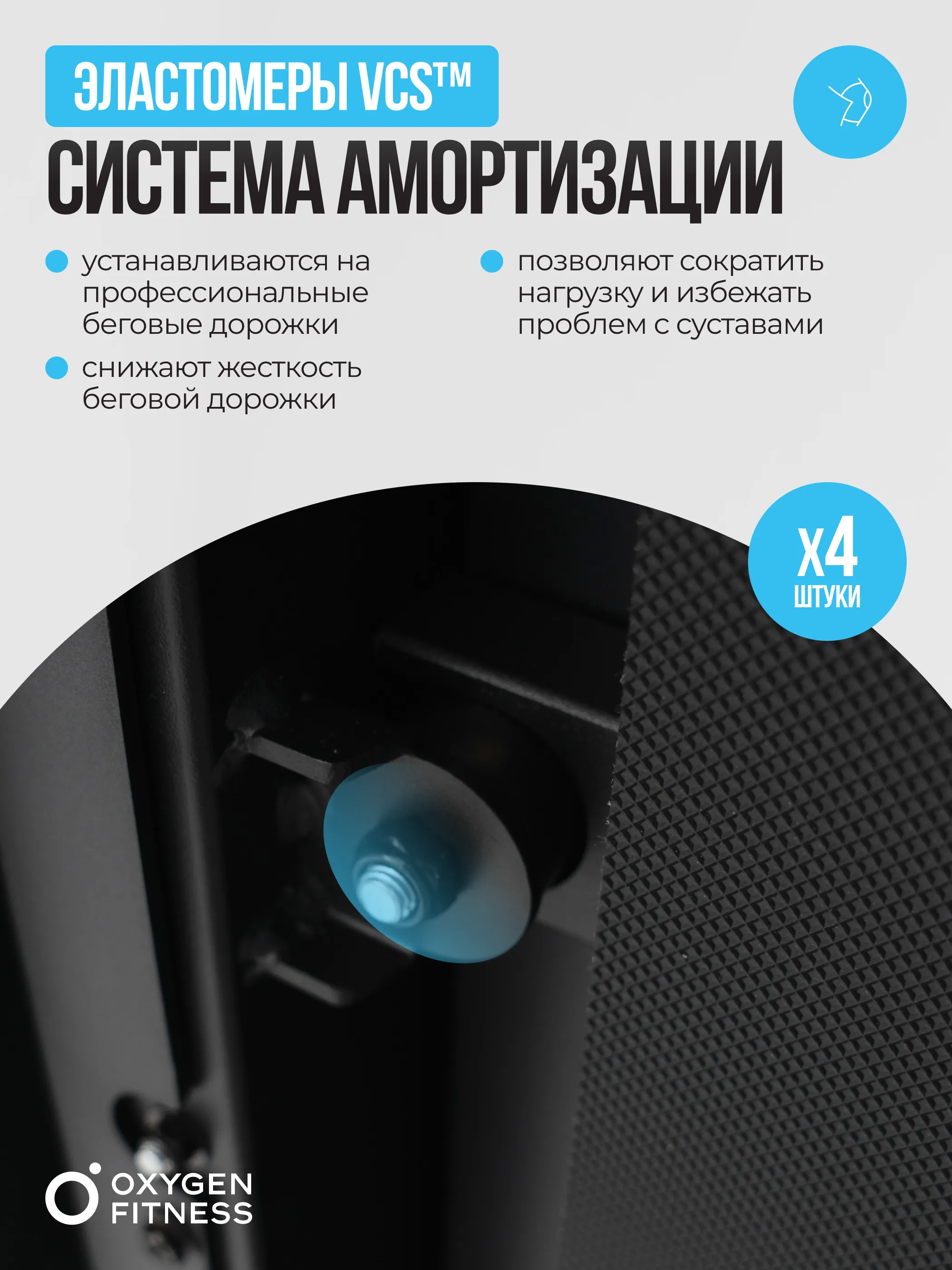 Система амортизации с 4 профессиональными эластомерами VCS™ смягчает удар и снижает нагрузку на суставы, обеспечивая комфортное беговое движение. Система измерения пульса включает сенсорные датчики на поручнях и поддержку беспроводного приемника HRC для нагрудных кардиодатчиков (приобретается отдельно), что позволяет контролировать свои показатели и следить за сердечным ритмом во время тренировки.