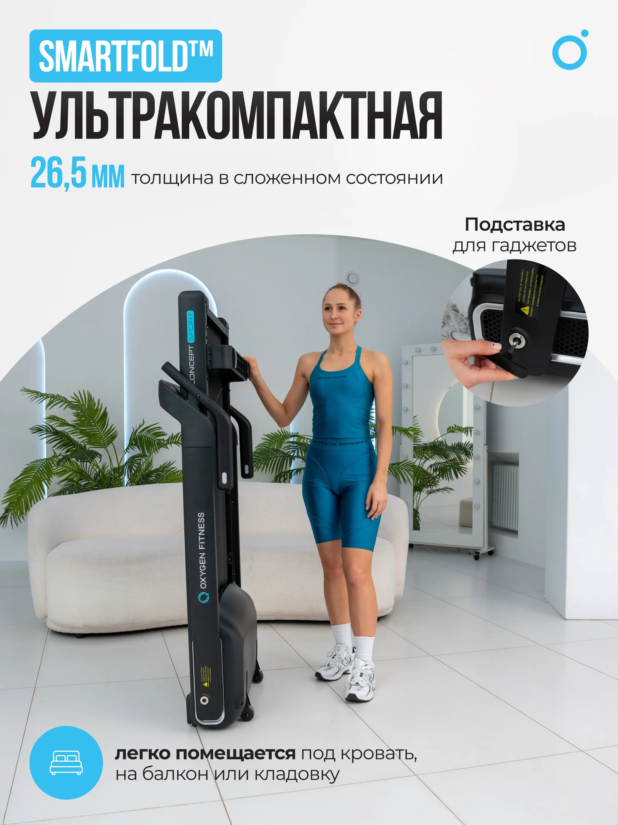 OXYGEN FITNESS X-CONCEPT SPORT обладает компактными размерами в сложенном виде и в рабочем состоянии, что позволяет легко разместить его дома. Тренажер также оснащен транспортировочными роликами и функцией ультракомпактного складывания Smart Fold для удобства хранения и перемещения.