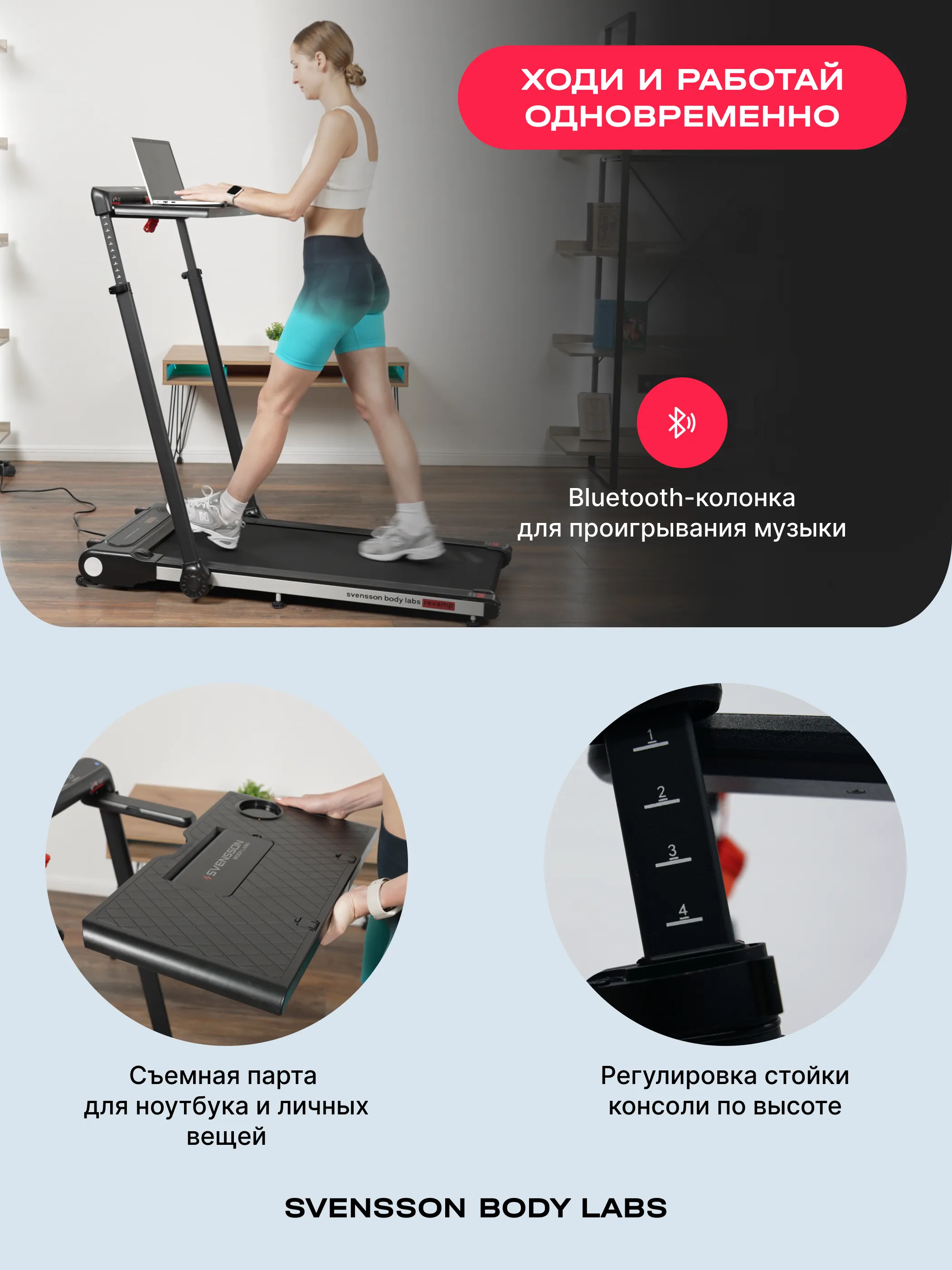 SVENSSON BODY LABS REVAMP оснащена Bluetooth-колонкой для воспроизведения музыки с телефона, что делает тренировки более увлекательными. Подставка для планшета или смартфона позволяет совмещать тренировки с просмотром фильмов или видеокурсов. Для удобства хранения предусмотрены складывающаяся конструкция и транспортировочные ролики.