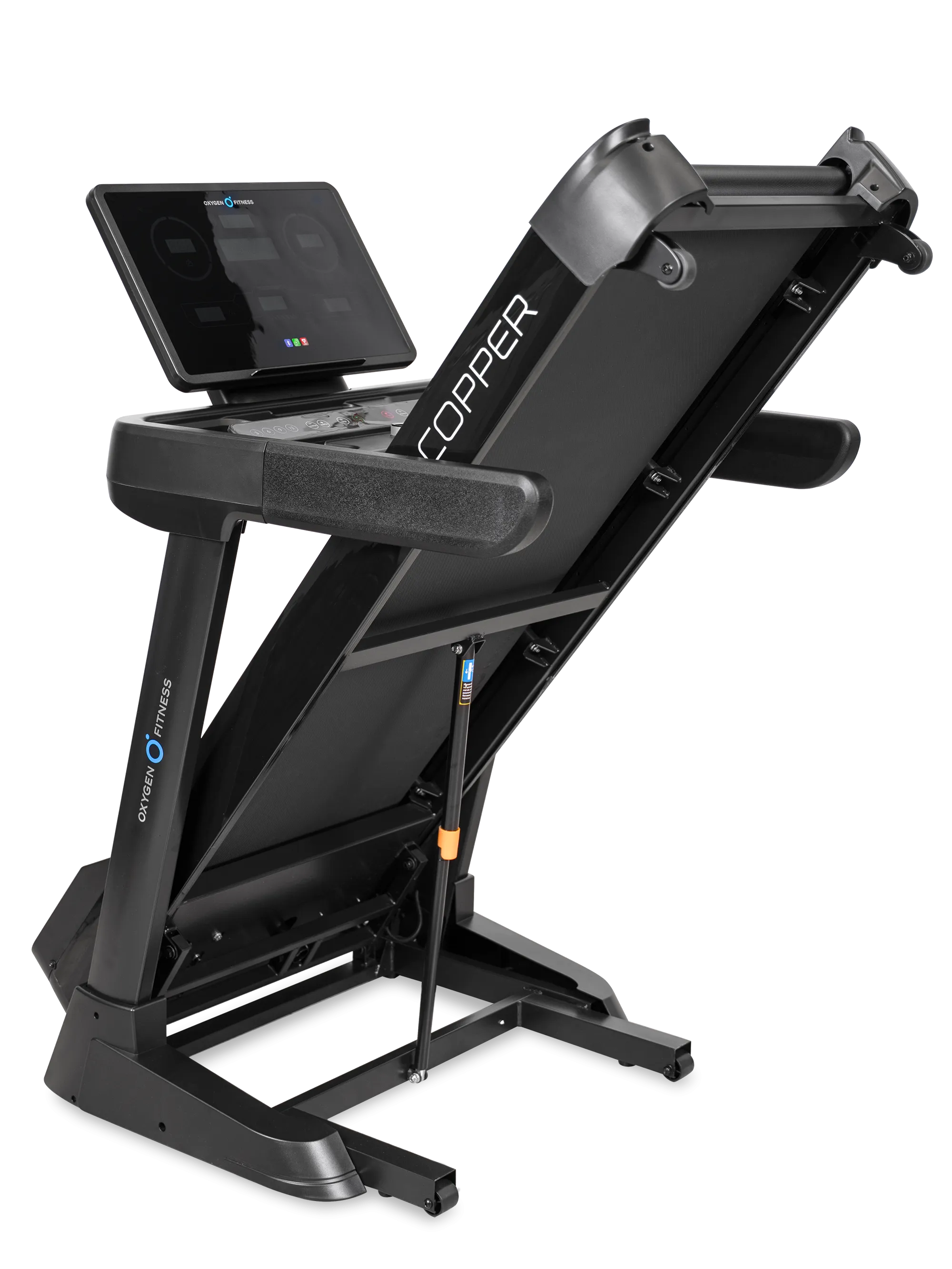 OXYGEN FITNESS COPPER — мощная электрическая беговая дорожка премиального уровня для полукоммерческого использование с интенсивной нагрузкой. Модель ориентирована на пользователей, которым важны высокая скорость, широкий беговой простор, продвинутая амортизация и современные технологии комфорта. COPPER подходит как для регулярных пробежек, так и для серьёзных тренировок с электронным наклоном и контролем показателей, обеспечивая ощущение клубного уровня у себя дома.