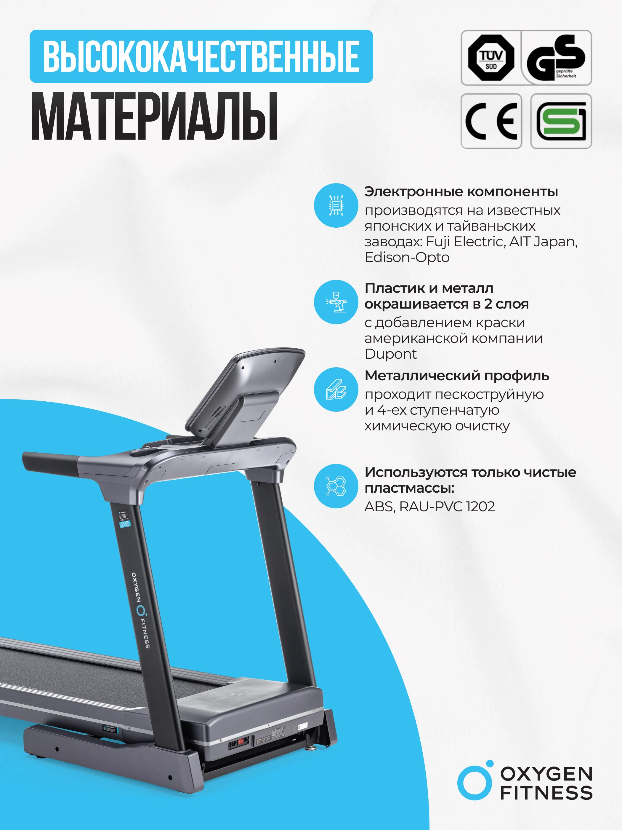 OXYGEN FITNESS COBALT LCD PRO не только высокотехнологична, но и удобна в использовании. Сенсорные датчики на поручнях точно измеряют ваш пульс, а беспроводной приемник HRC поддерживает работу с кардиодатчиками, которые можно приобрести отдельно для еще большей точности. Встроенные транспортировочные ролики и компенсаторы неровностей пола обеспечат простоту перемещения и установки дорожки в любом месте вашего дома или фитнес-зала.