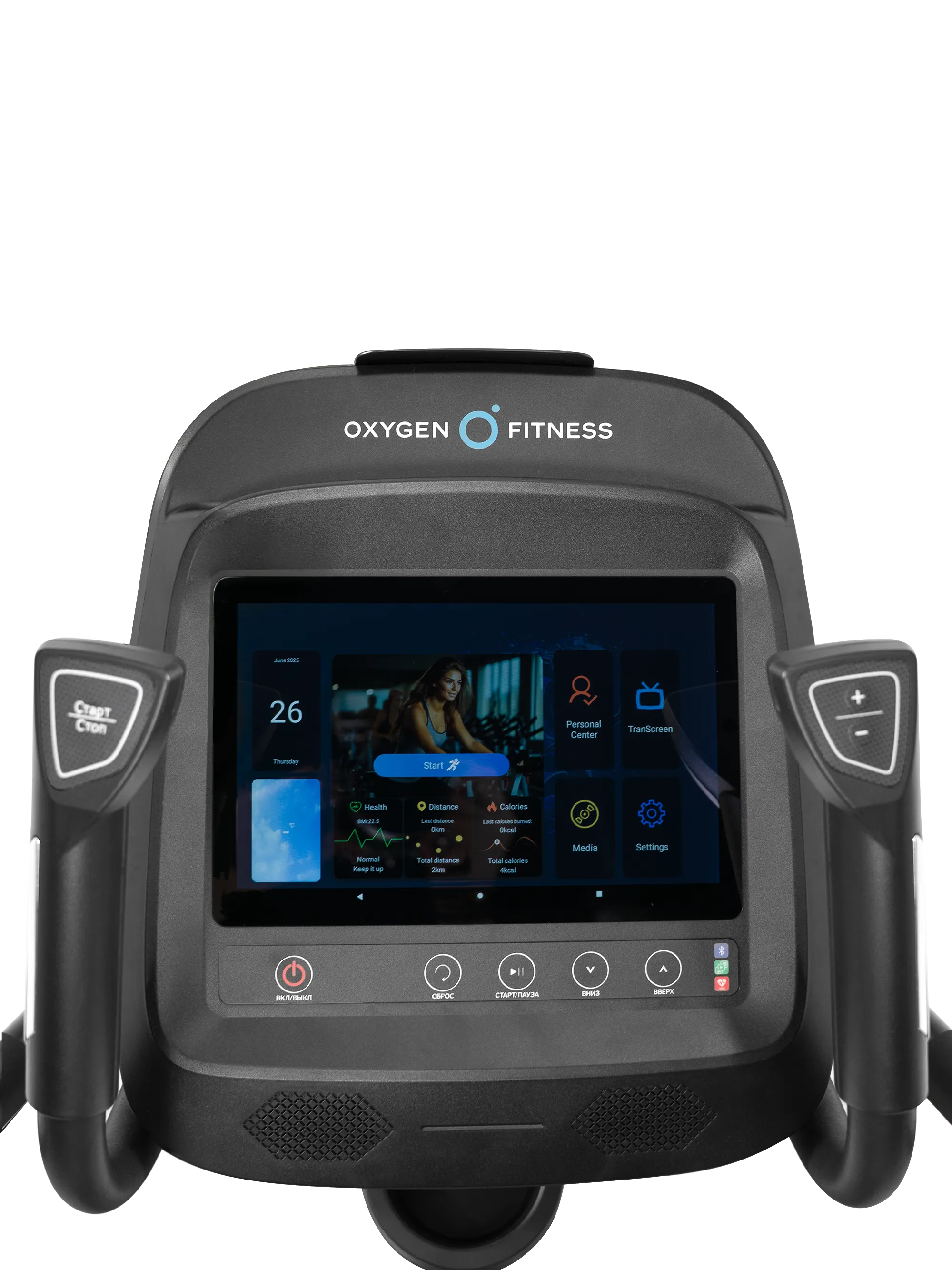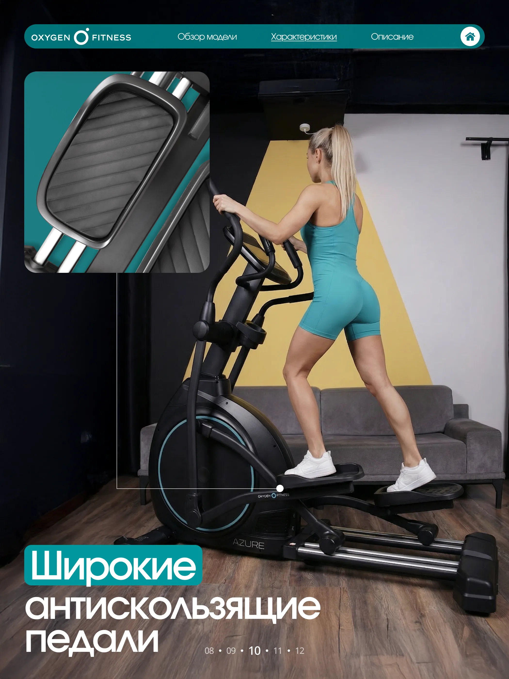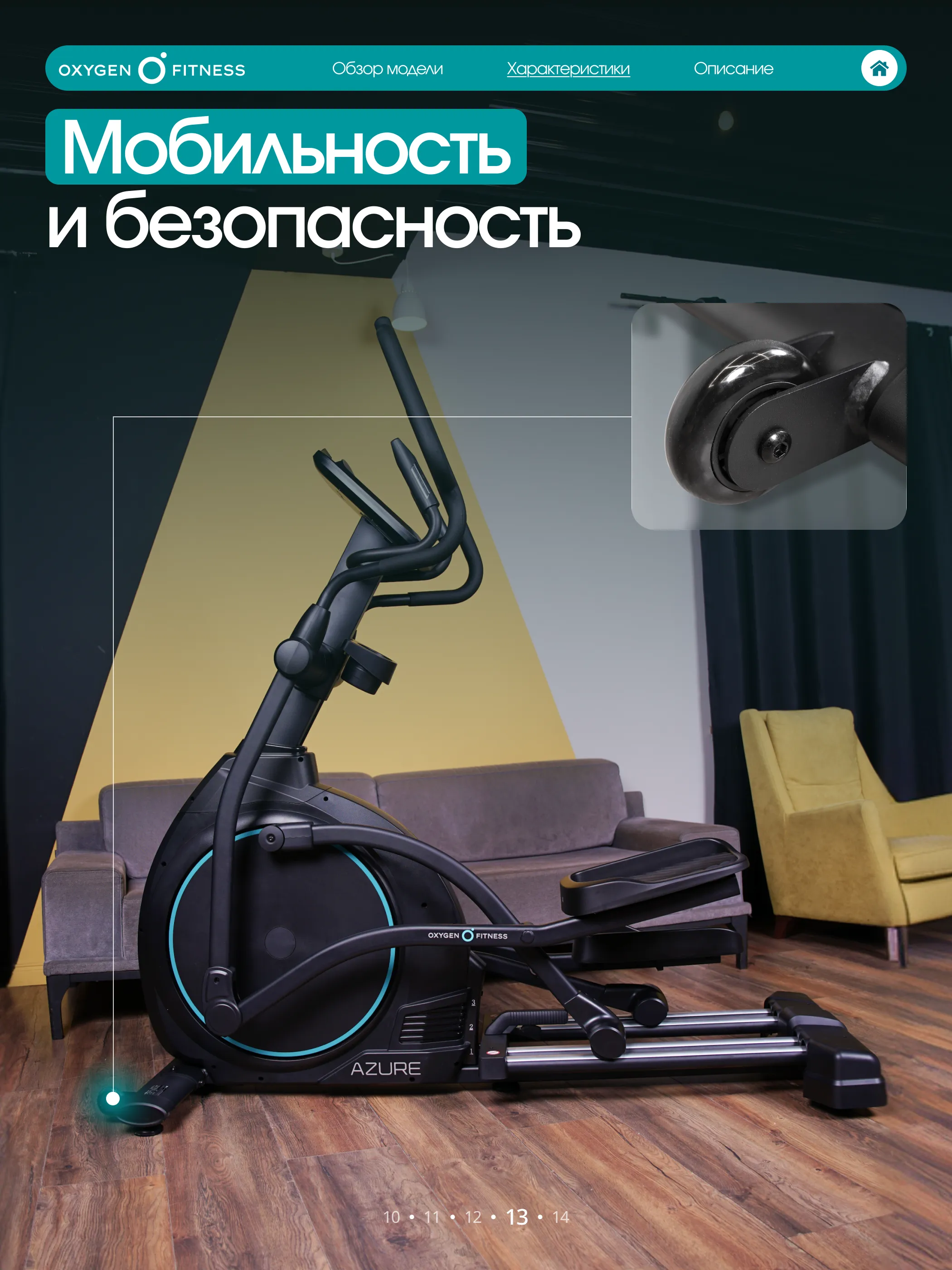 OXYGEN FITNESS AZURE — высокотехнологичный эллиптический тренажёр для домашних тренировок продвинутого уровня. Модель ориентирована на пользователей, которым важна длина шага, точная настройка нагрузки, работа по пульсу и расширенная аналитика тренировки. AZURE сочетает в себе эргономику клубного оборудования и функциональность, адаптированную для комфортного использования дома.