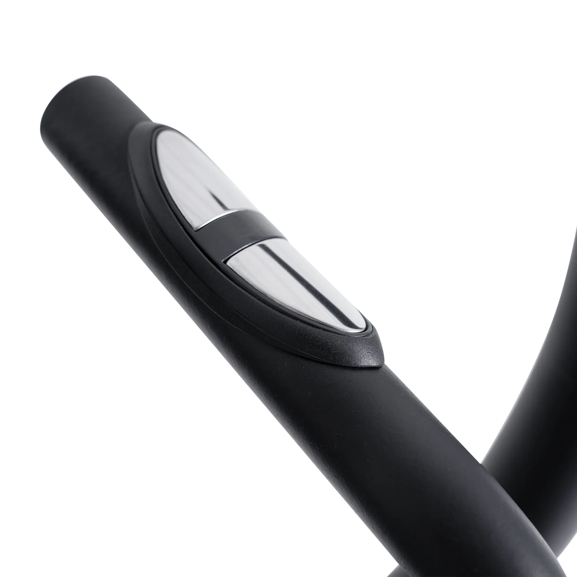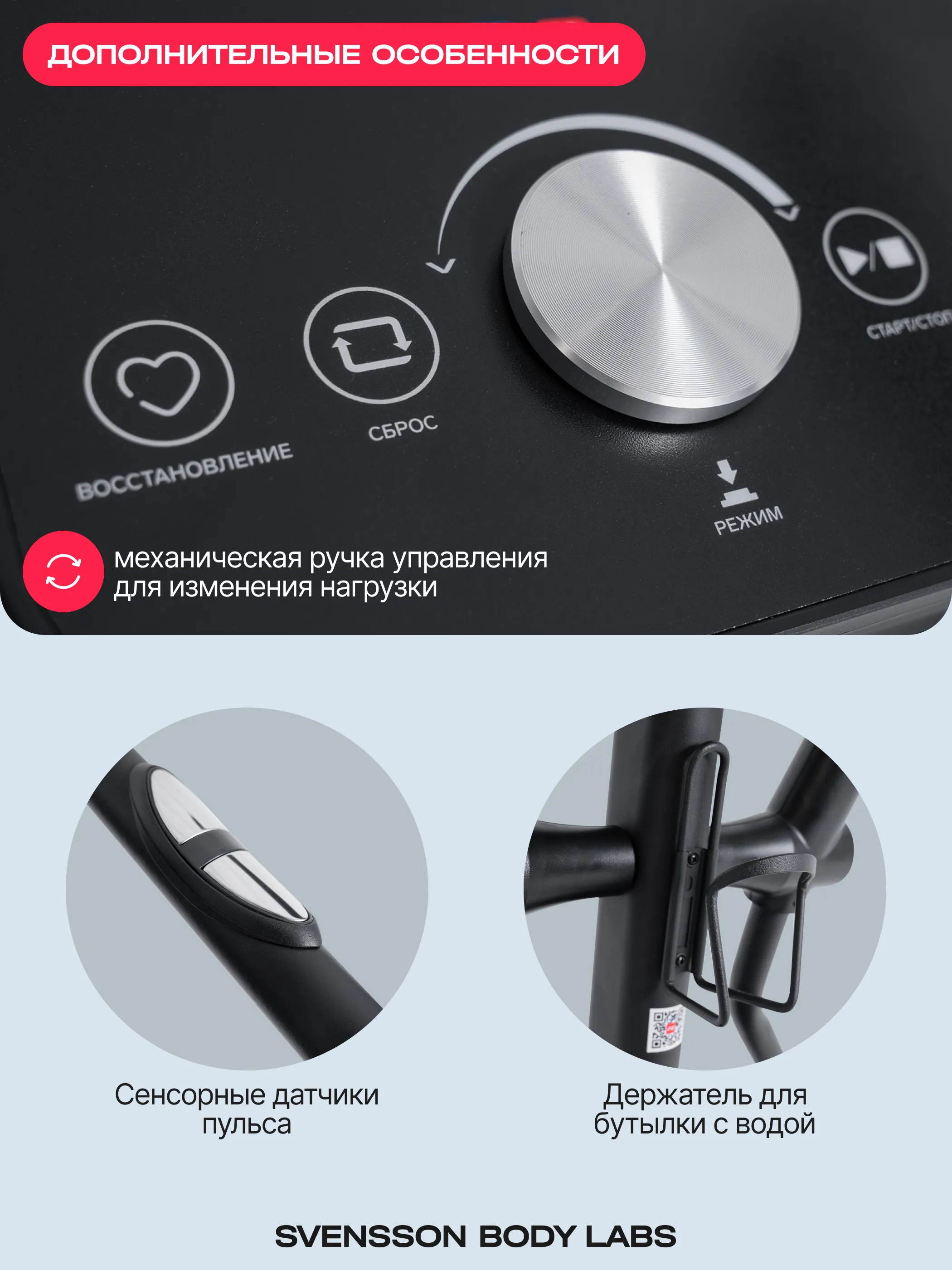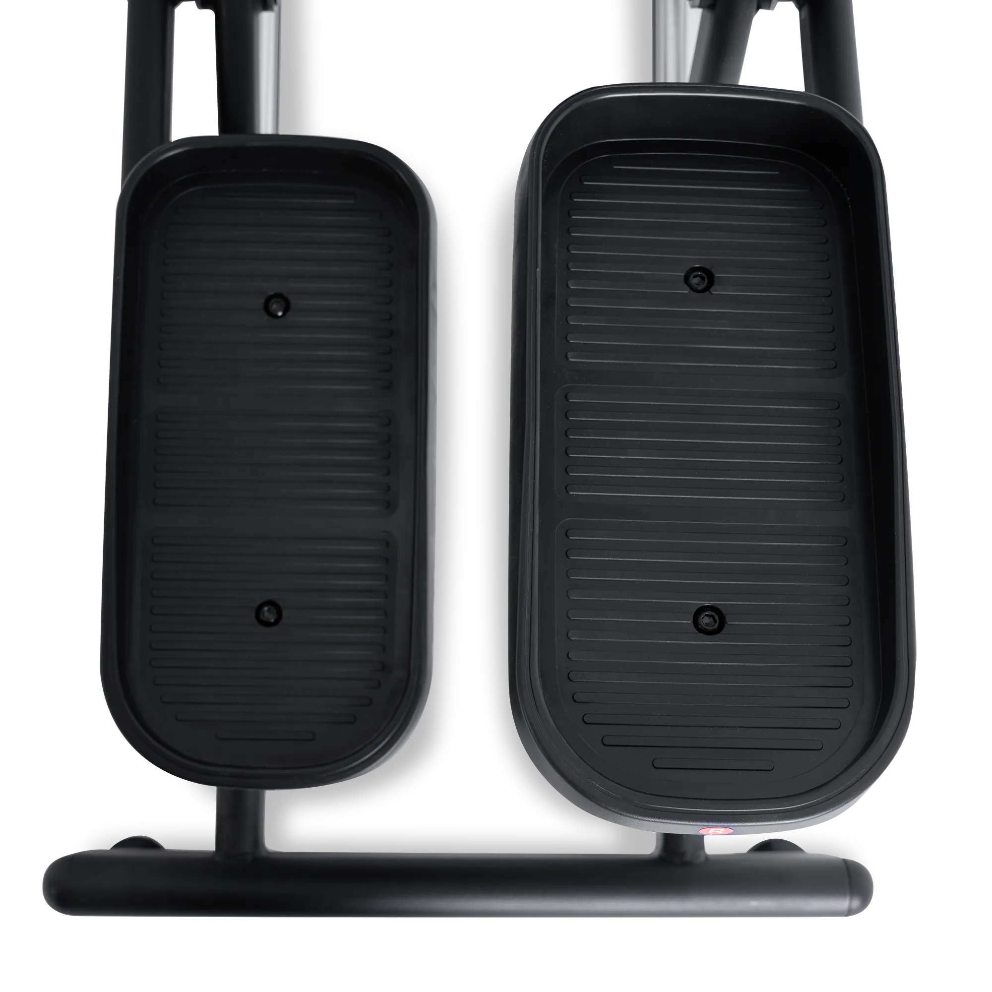 Тренажер предлагает инерционный вес маховика в 24 кг, что обеспечивает плавный и комфортный ход. Расстояние между педалями составляет всего 30 мм, что способствует естественному движению во время тренировки. Длина шага в 500 мм и антискользящие педали увеличенного размера гарантируют безопасные и эффективные занятия. Двухпозиционные нескользящие рукоятки с сенсорными датчиками пульса позволяют контролировать сердечный ритм во время тренировки.
