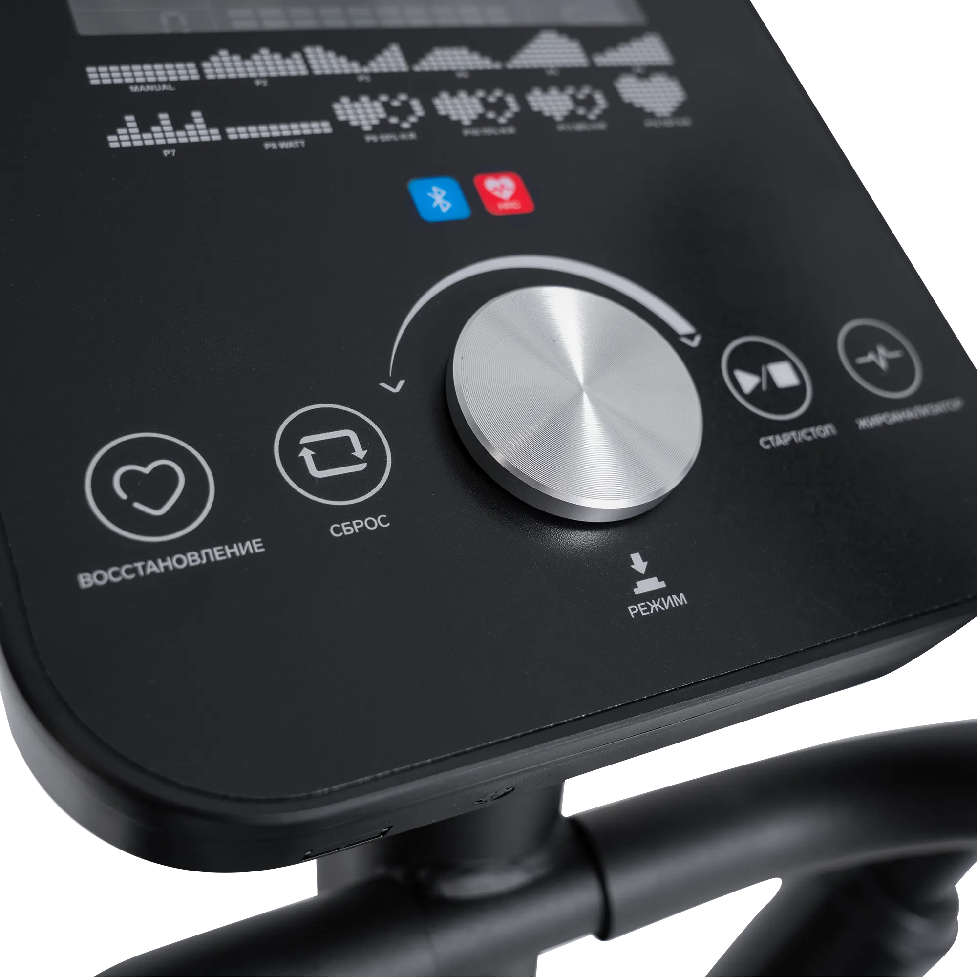 Консоль с LED-дисплеем белой индикации отображает время, скорость, дистанцию, пульс, уровень нагрузки, калории и обороты. С 12 программами тренировок, включая ручной режим, предустановленные и пульсозависимые, вы сможете разнообразить свои занятия. Возможность подключения к тренировочным мобильным приложениям (Kinomap™, Fitshow™) через Bluetooth добавляет элемент интерактивности и мотивации.