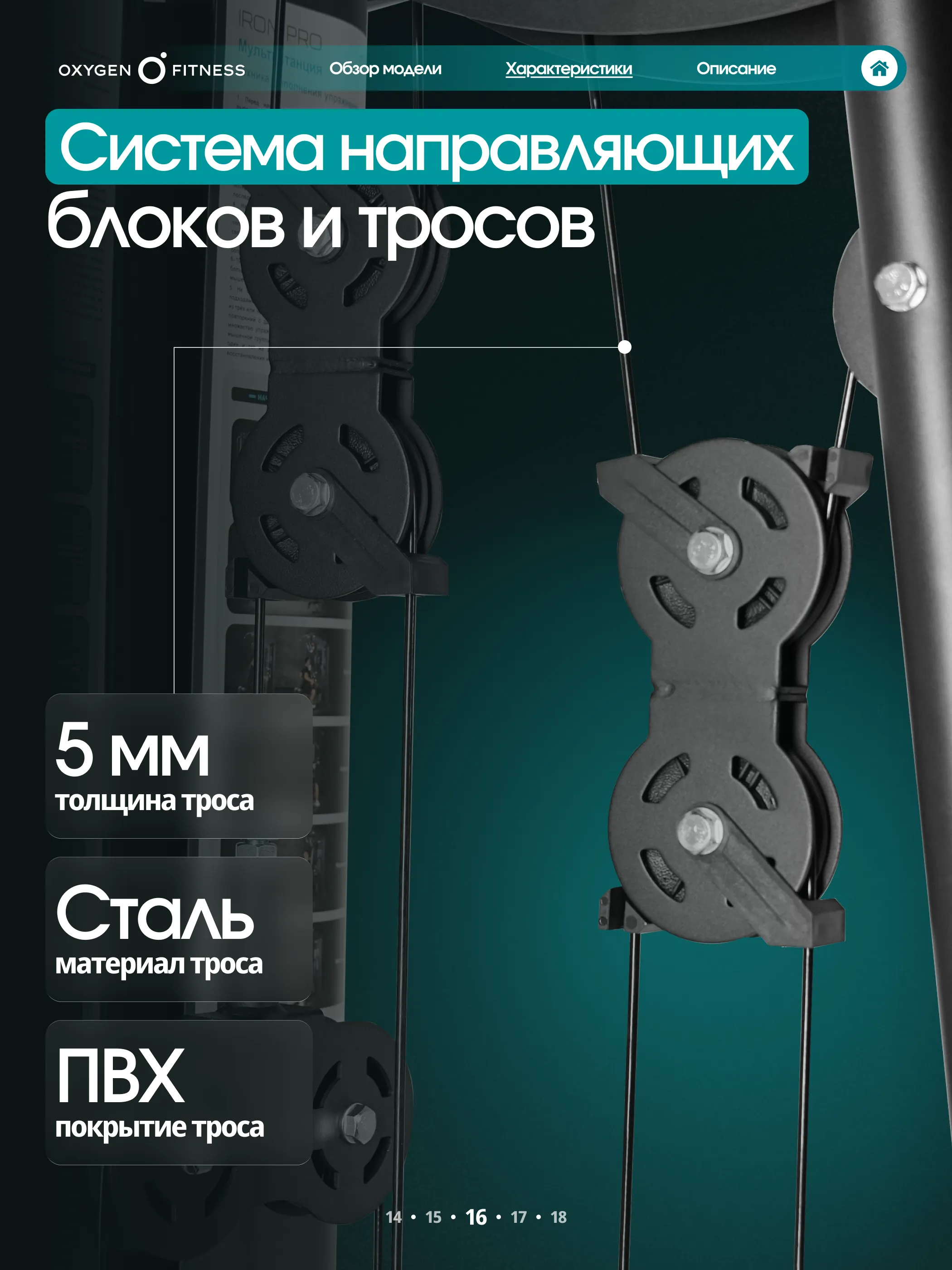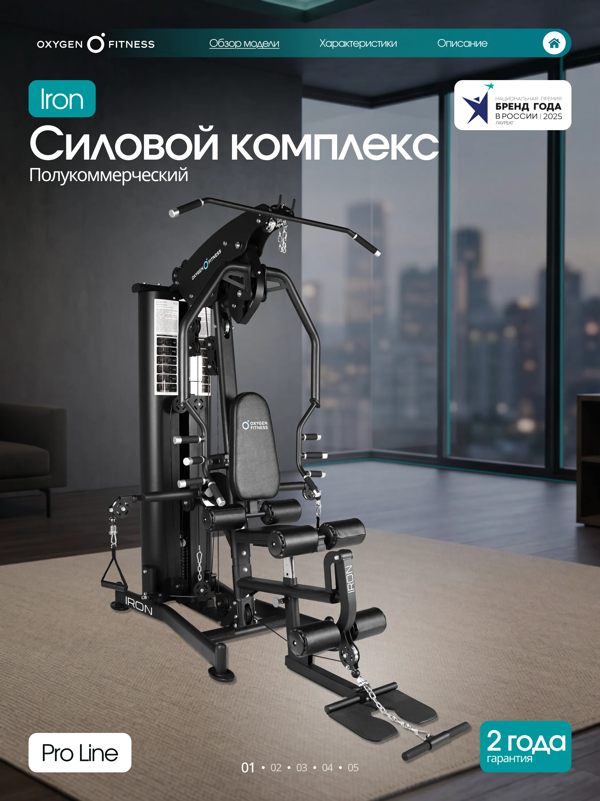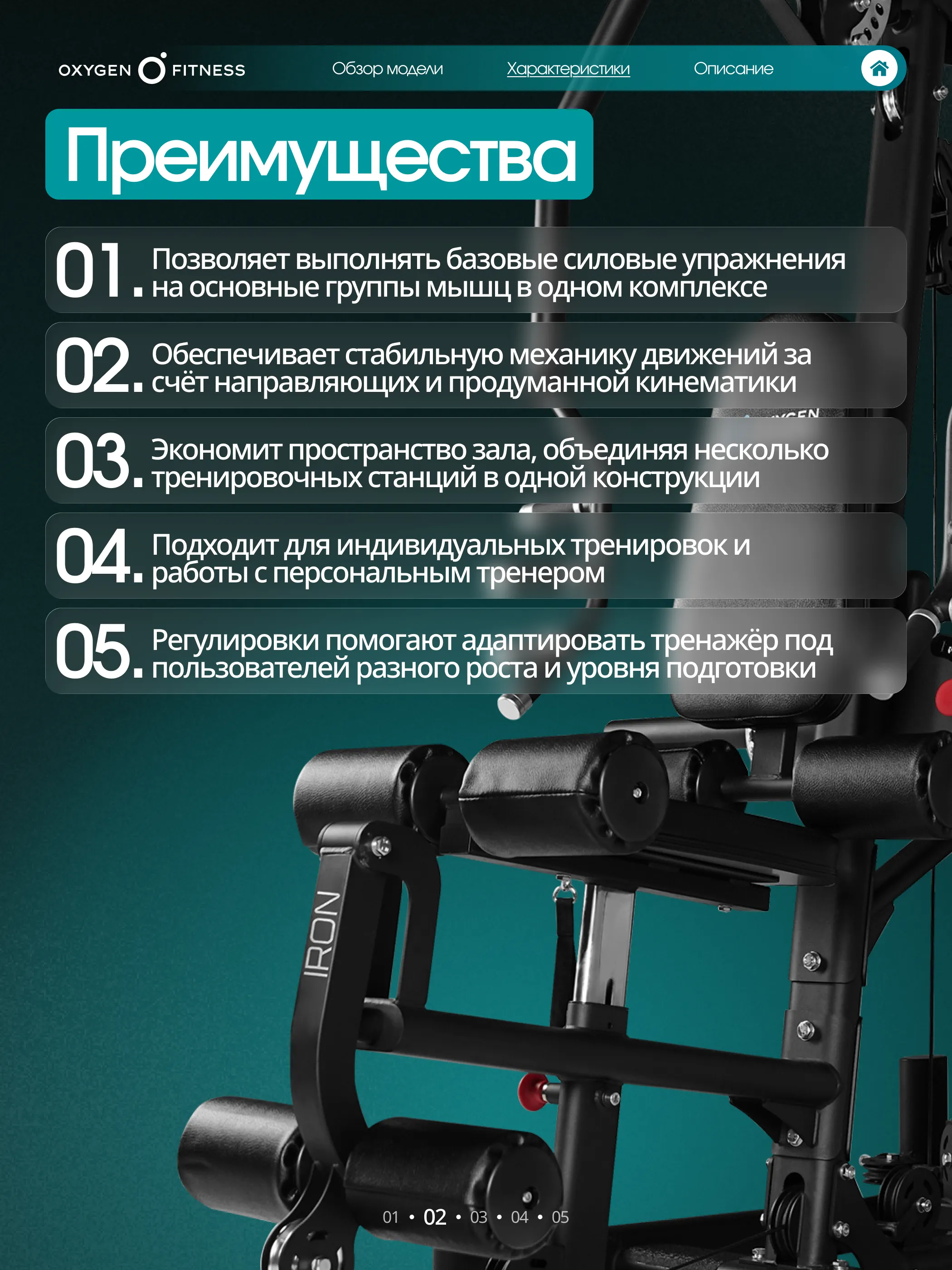 OXYGEN FITNESS IRON — это универсальный силовой комплекс, созданный для полноценной тренировки всего тела на профессиональном уровне. Модель сочетает в себе прочную конструкцию, плавную работу механизмов и широкий диапазон регулировок, позволяя выполнять десятки упражнений на основные группы мышц: грудь, спину, плечи, руки и ноги.