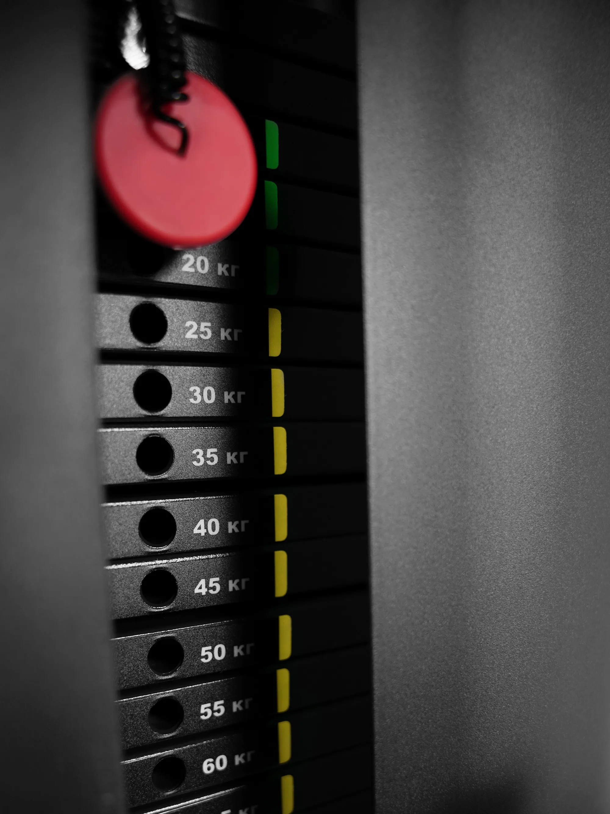 Силовая нагрузка реализована через грузоблочный стек 90 кг, состоящий из 17 композитных плит по 5 кг. Такая система позволяет точно подбирать рабочий вес и постепенно увеличивать нагрузку по мере роста силы.