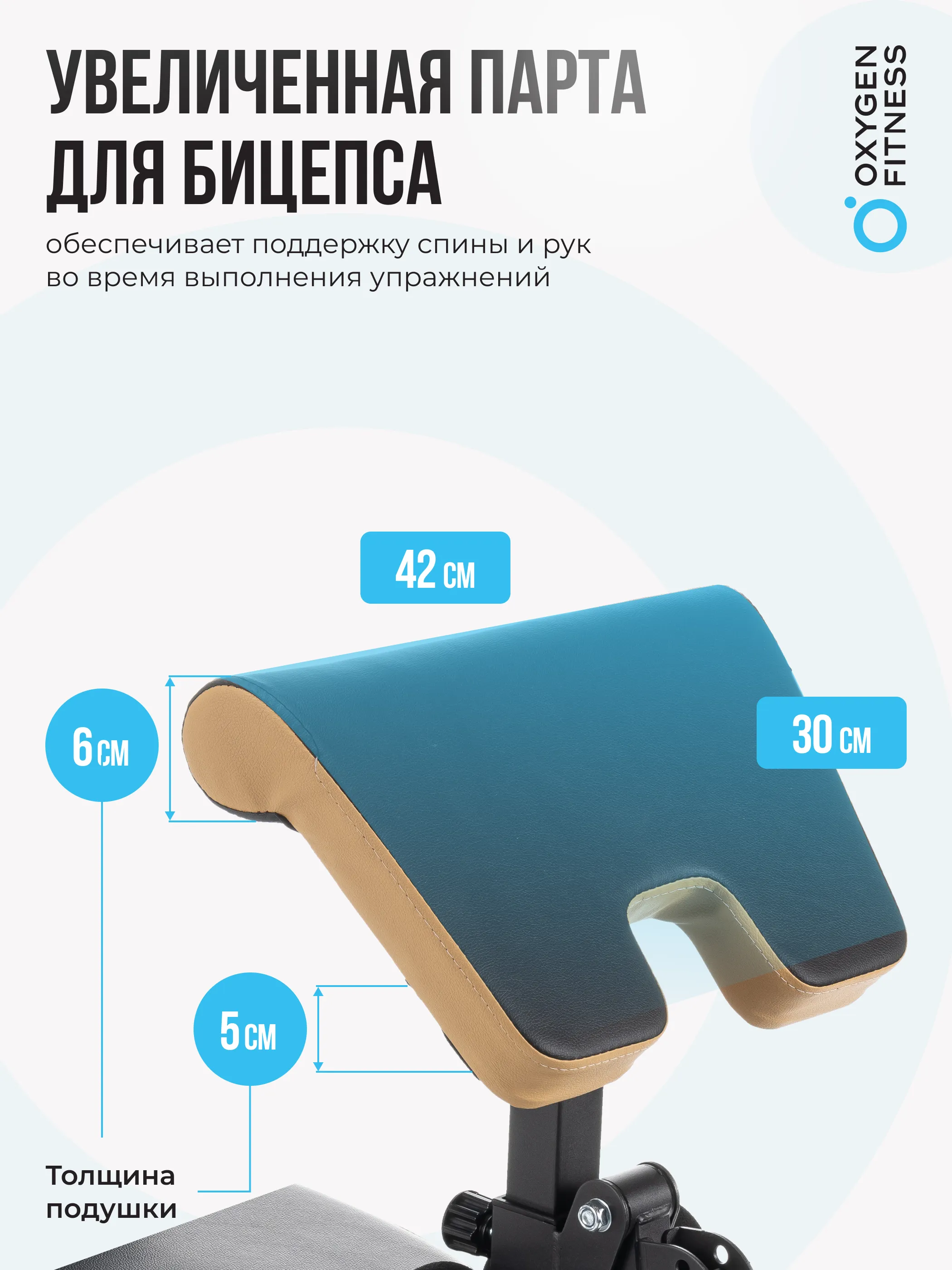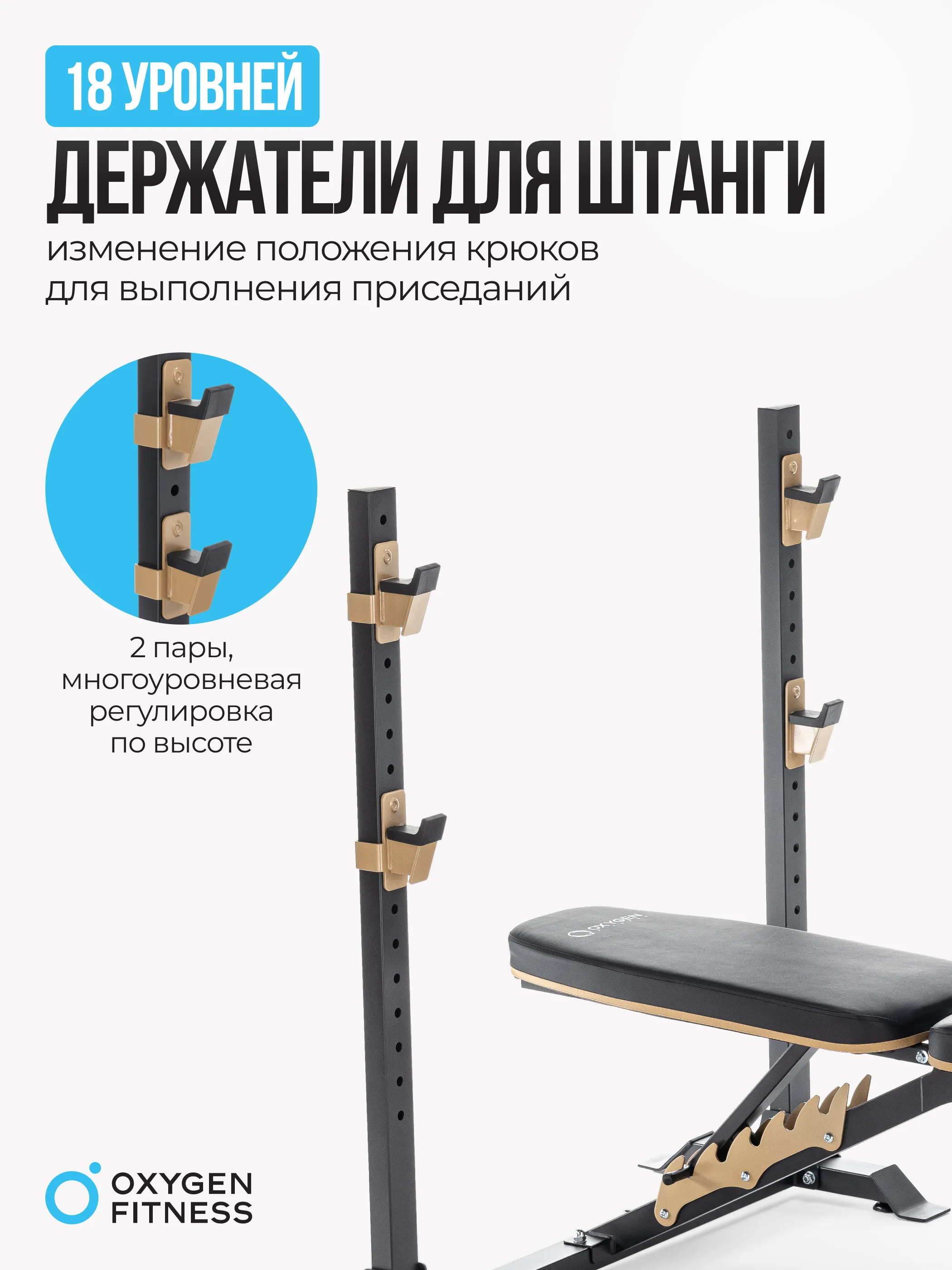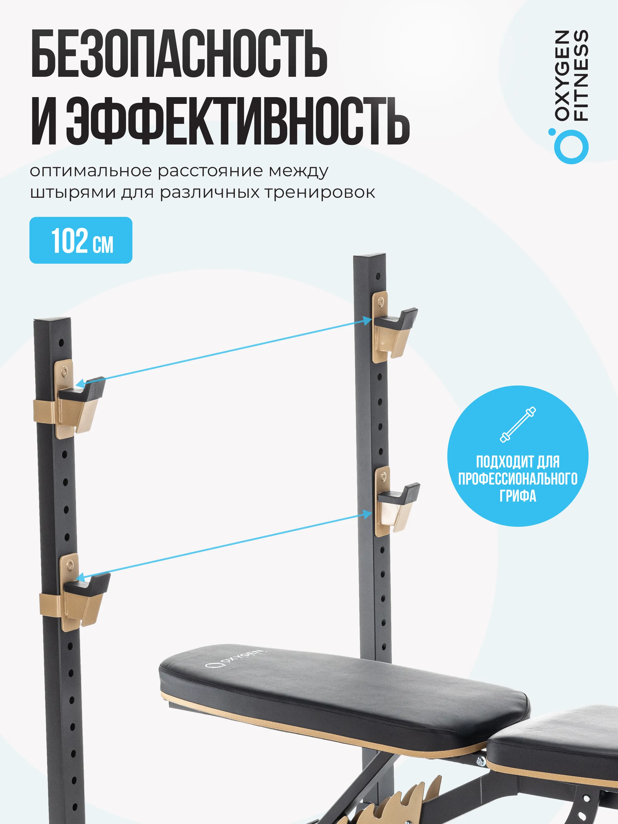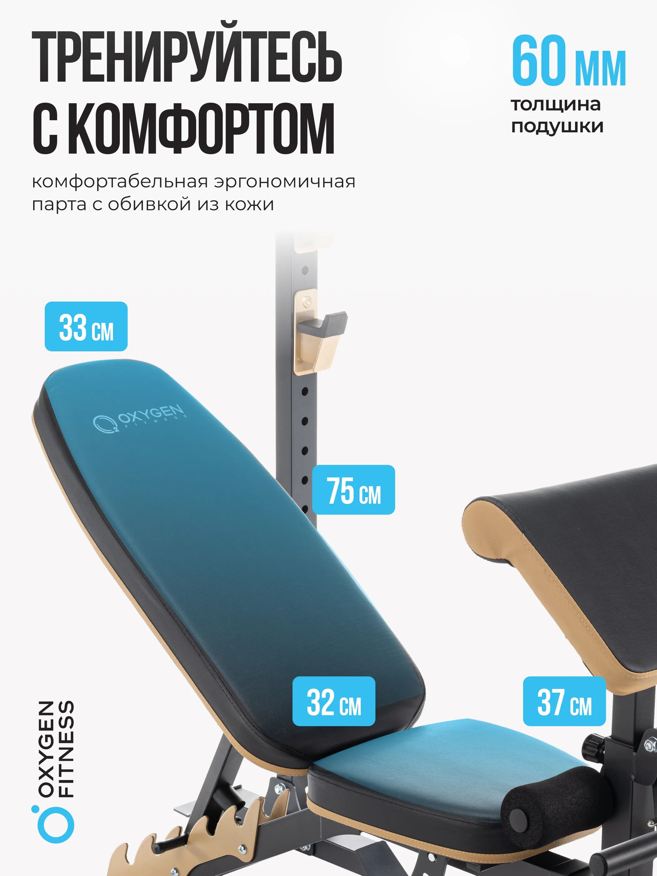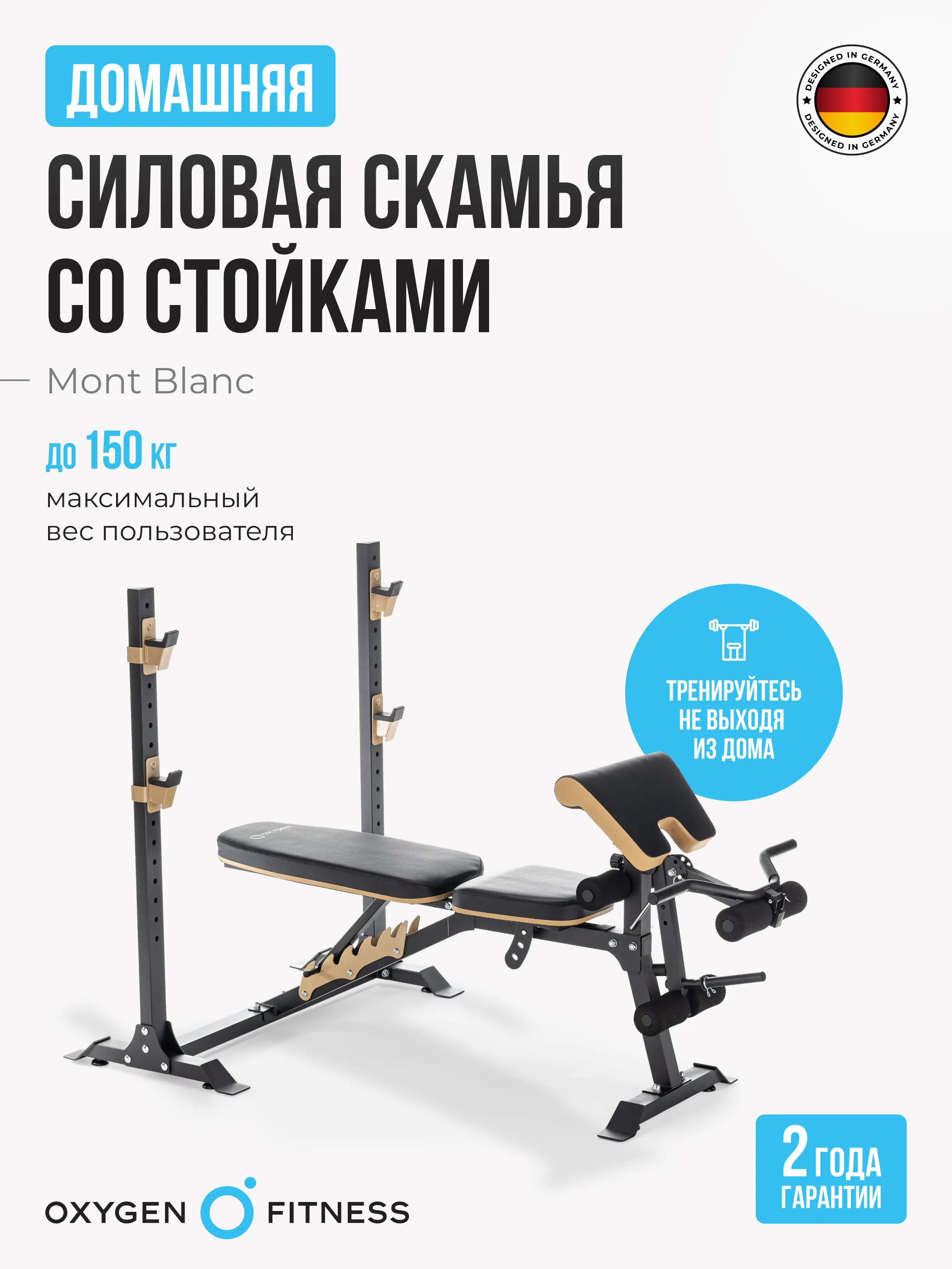 OXYGEN FITNESS MONT BLANC - это усиленная многофункциональная силовая скамья, имеющая мощный прямоугольный профиль размером 50*50 мм. Выдерживает нагрузку до 150 кг. По сути состоит из двух блоков - собственно скамьи для жима с партой на бицепс и стойки под штангу. Стойку нельзя использовать независимо от скамьи.