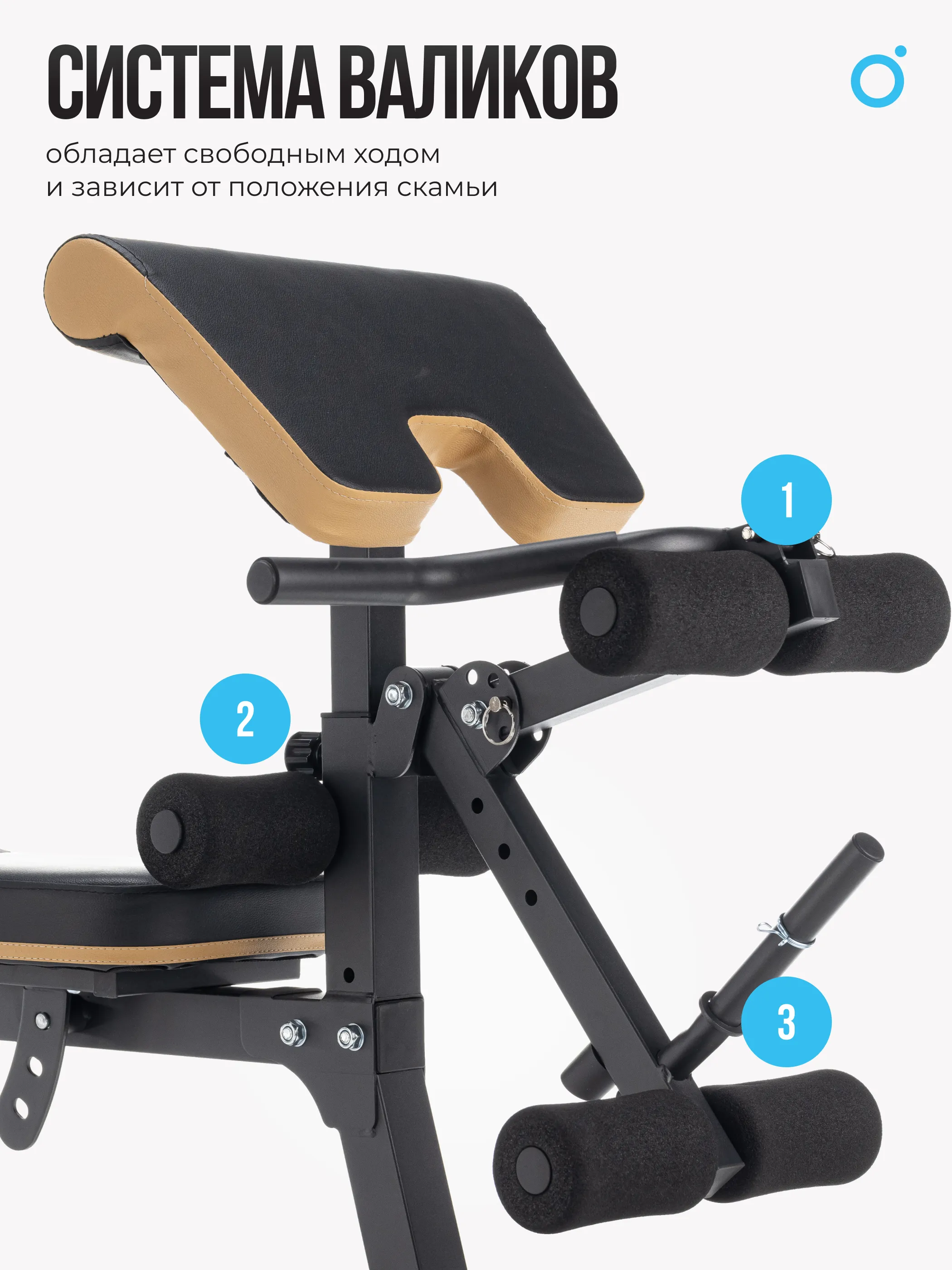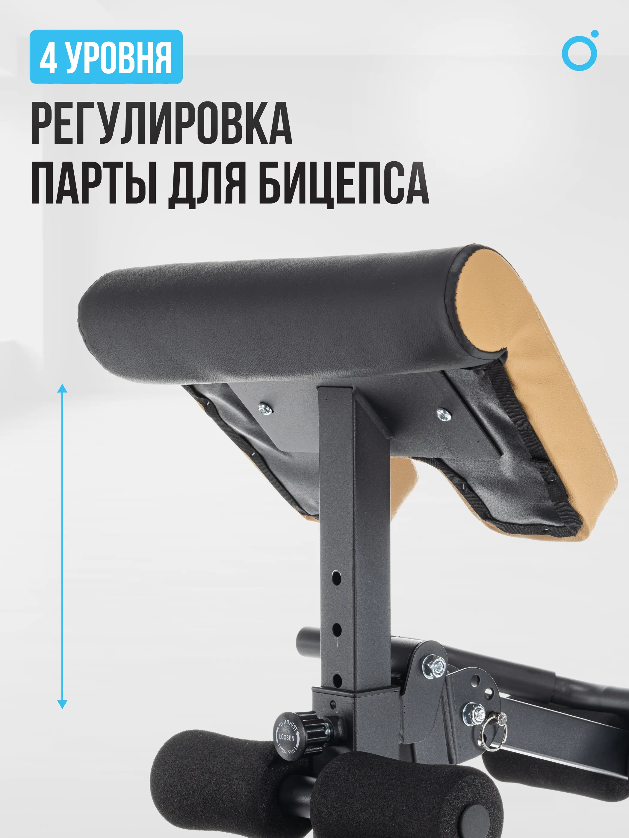 Скамью можно использовать в нескольких положениях - с высоко поднятой спинкой для выполнения упражнений на бицепс (совместно с партой на бицепс), как скамью с положительным наклоном, как горизонтальную скамью и как скамью с отрицательным наклоном. Парта на бицепс регулируется в 4-ех положениях и при необходимости выполнения упражнений на сгибание либо разгибание ног ее можно снять. Обивка сидения и спинки выполнена по специальной технологии, которая представляет из себя искусственную комбинированную кожу из высококачественного полиуретана. Центральная часть обивки выполнена из материала со специальной антискользящей поверхностью, которая надежно фиксирует положение тела. Поверхность сидения и спинки - контурное и полностью соответствует антропометрическим параметрам подавляющего большинства пользователей. Стойку под штангу можно использовать в двух вариантах - в сочетании со скамьей для жима штанги и отдельно для приседов. Особенностью стойки является наличие не двух, а четырех держателей для штанги. Это позволяет абсолютно безопасно, в одиночку и без партнера, выполнять жим штанги от груди.