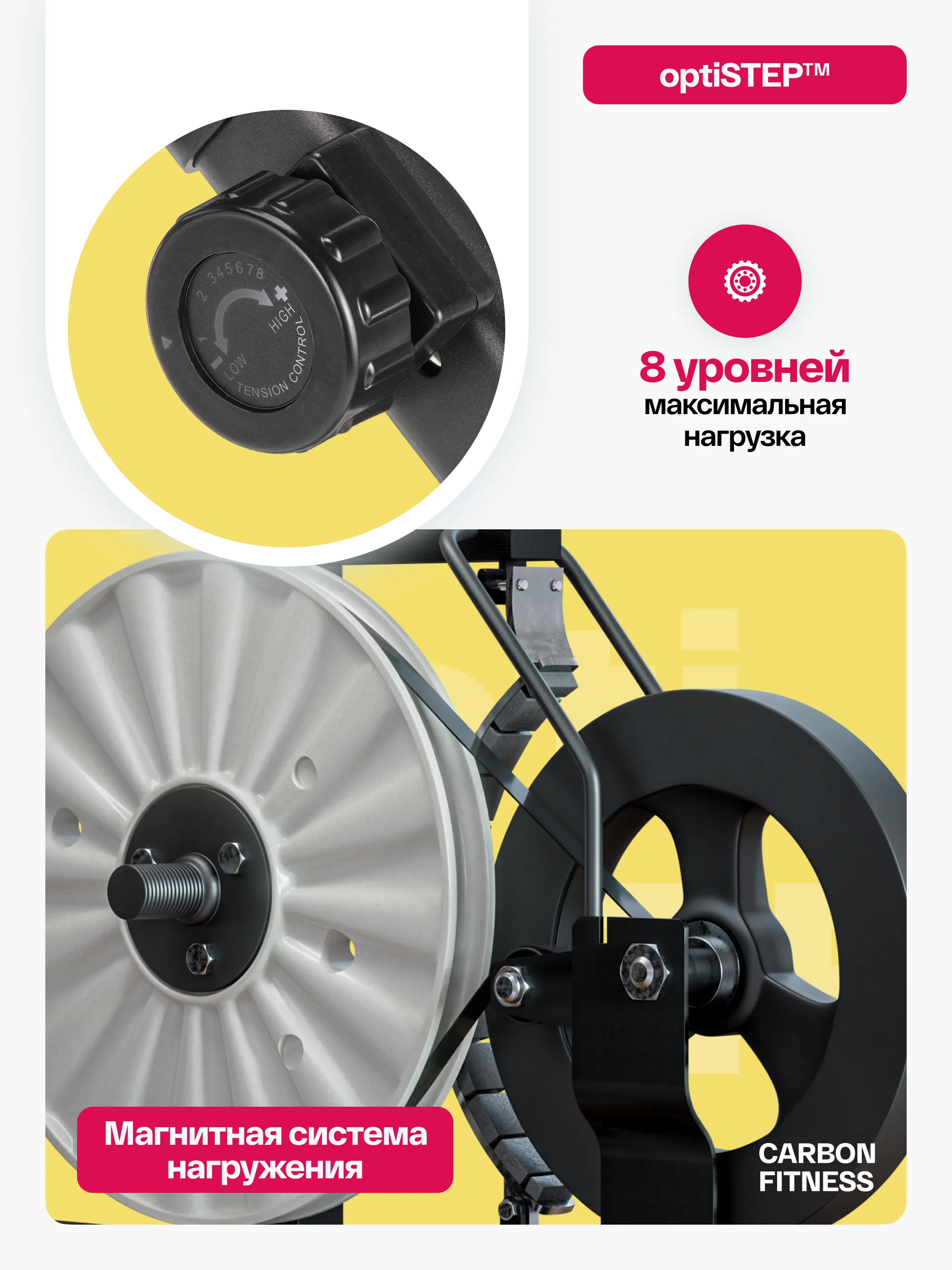 Магнитная система нагружения optiSTEP™ с восемью уровнями нагрузки позволяет настроить интенсивность тренировки под свои потребности. Однокомпонентный литой шатун педального узла и прорезиненные педали с регулируемыми ремешками обеспечивают комфорт и безопасность во время занятий. Эргономичное сиденье с спинкой и поручнями и регулировкой по горизонтали позволяет настроить его под ваше удобство.