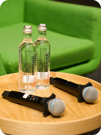 Чёрно-оранжевая айдентика встречала гостей у входа, продолжалась в зоне навигации, в оформлении дверей и в тех деталях, которые задают общий визуальный ритм. В зале для выступлений нижняя часть сцены была выполнена в цветах Bronze Gym, стартовые и переходные экранные заставки поддерживали этот язык в течение всего дня. Бутылки с водой, которые участники держали в руках на протяжении форума, были с этикеткой Bronze Gym.