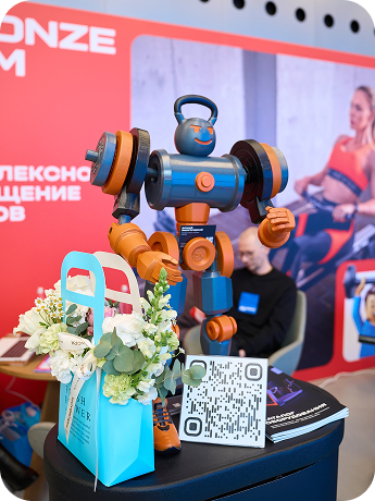 Впервые появился новый персонаж Bronze Gym — бренд-маскот, созданный специально для будущих мероприятий и презентаций. Фигура робота в фирменных чёрно-оранжевых цветах - массивные формы, детали, собранные как из элементов тренажёров. Его сделали не просто декоративным объектом, а визуальным символом бренда — узнаваемым, живым, с тем самым настроением Bronze Gym. На этом форуме робот представился впервые, и стало очевидно, что теперь он будет частью всех будущих зон бренда.