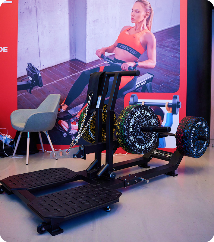 Силовое направление было представлено моделью BRONZE GYM RV15 «Маятниковый присед». Это новейшая серия тренажеров нагружаемых дисками RAVE. Модель не надо было «презентовать» — она говорила сама за себя. Один начинал движение, двое наблюдали, третий задавал вопросы про механику, четвёртый сразу спрашивал про сроки поставки. Люди не смотрели. Они ощущали ход, сравнивали амплитуду с тем, что стоит у них в клубе, обсуждали, как рама поведёт себя при трафике в часы пик. Было заметно, что это не любопытство, а прямой рабочий интерес — когда человек уже держит в голове конкретное помещение и прикидывает, куда модель встанет и как закроет задачу.