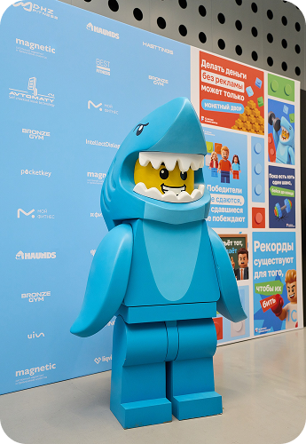 Брендинговая линия Bronze Gym продолжалась и в том, что участники уносили с собой. В welcome-пак входили блокнот и ручка бренда — многие пользовались ими весь день, делая пометки во время выступлений. Там же лежал совместный брелок Bronze Gym × 1С в виде лего-акулы с металлическим жетоном. Это тот формат сувенира, который легко оказывается на ключах или рюкзаке и напоминает о событии уже после форума, а не оседает в ящике стола.