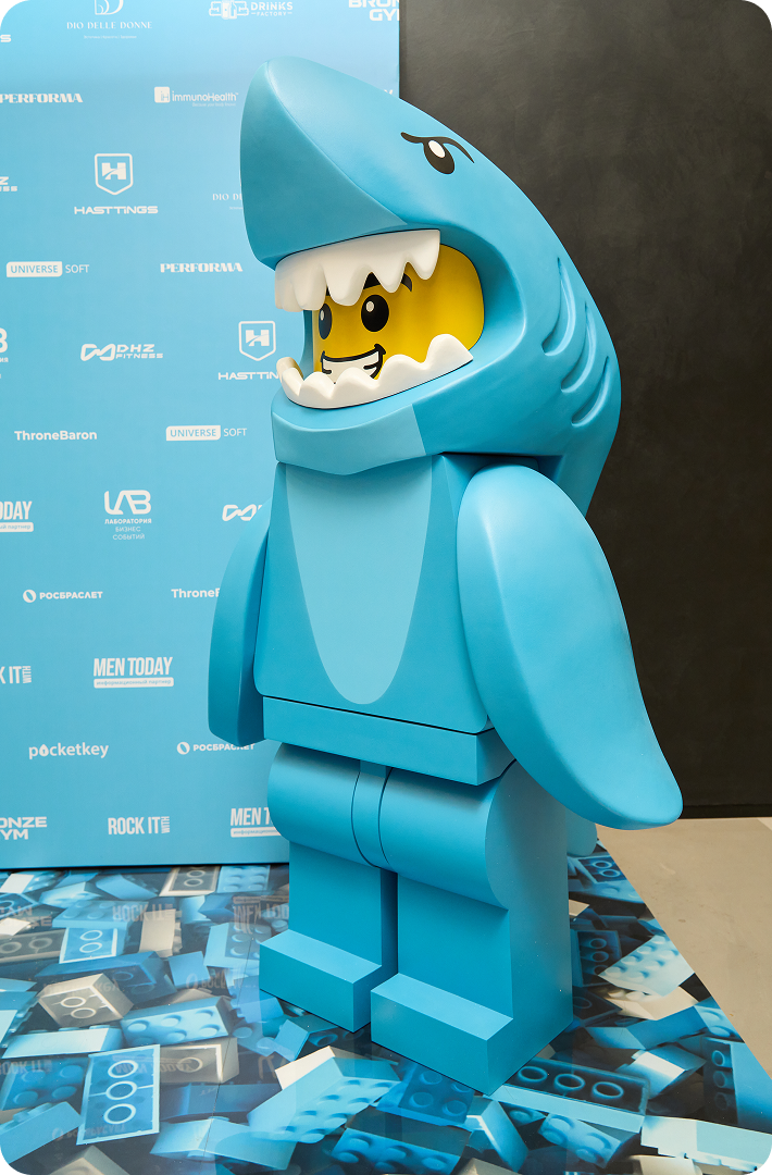 Конечно мы позаботились и том, что останется с участником после форума. В каждую welcome-сумку мы положили блокнот, ручку и совместный брелок Bronze Gym × 1С - это лего-акула и металлический жетон Bronze Gym. Данный предмет, мы уверены, будет красоваться у вас на ключах, рюкзаке или сумке для зала. Такой брелок — короткий способ сказать «я часть этого комьюнити» без слов.